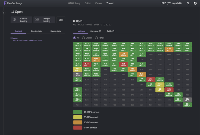 La aplicación Freebetrange funciona directamente en tu navegador y cuenta con las secciones Editor, Visualizador, Entrenador y Biblioteca GTO. A continuación las mostramos brevemente; la explicación completa de todas las funciones se puede encontrar en nuestro manual del usuario.